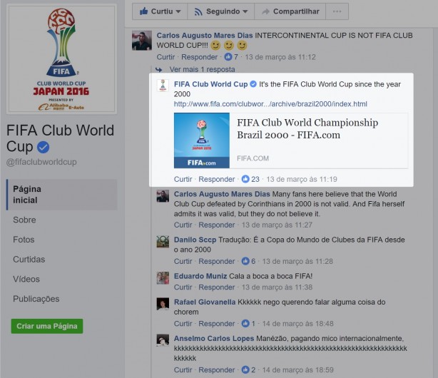 Logo após, torcedores rivais, furiosos, responderam a entidade. Num dos comentários, um torcedor lembrou que o Mundial de 2000 foi disputado como Copa Intercontinental. A entidade não se calou e respondeu. “Isto é Mundial de Clubes da Fifa desde o ano de 2000”.