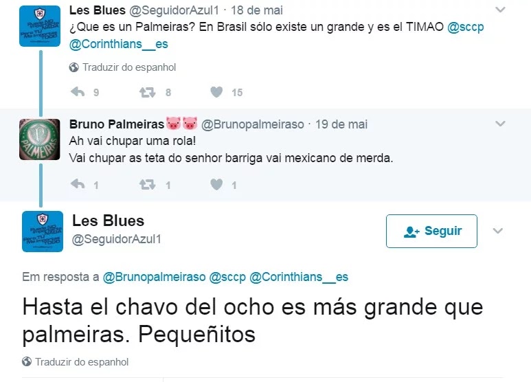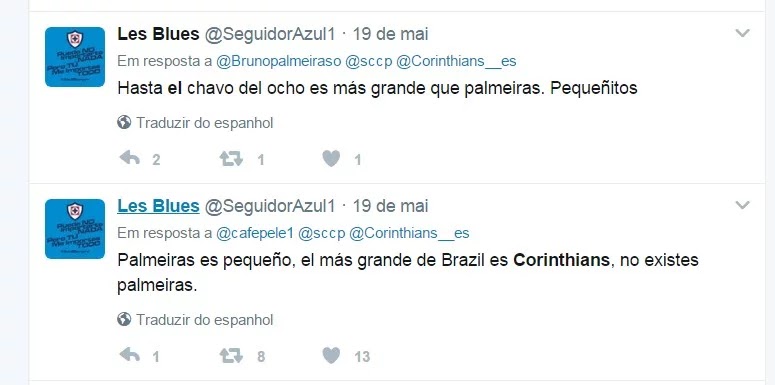 Abaixo, separamos os principais trechos da discussão, onde um torcedor do Cruz Azul com o nome de Les Blues – @SeguidorAzul1 afirma que até o Chaves – famoso seriado infantil consagrado no Brasil pelo STB – é maior que o Palmeiras.