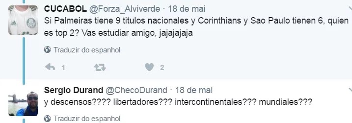Por fim, um palmeirense tenta argumentar que o clube supostamente teria nove títulos nacionais, considerado até uns que chegaram via fax pela CBF. Outro mexicano aparece na conversa e responde.