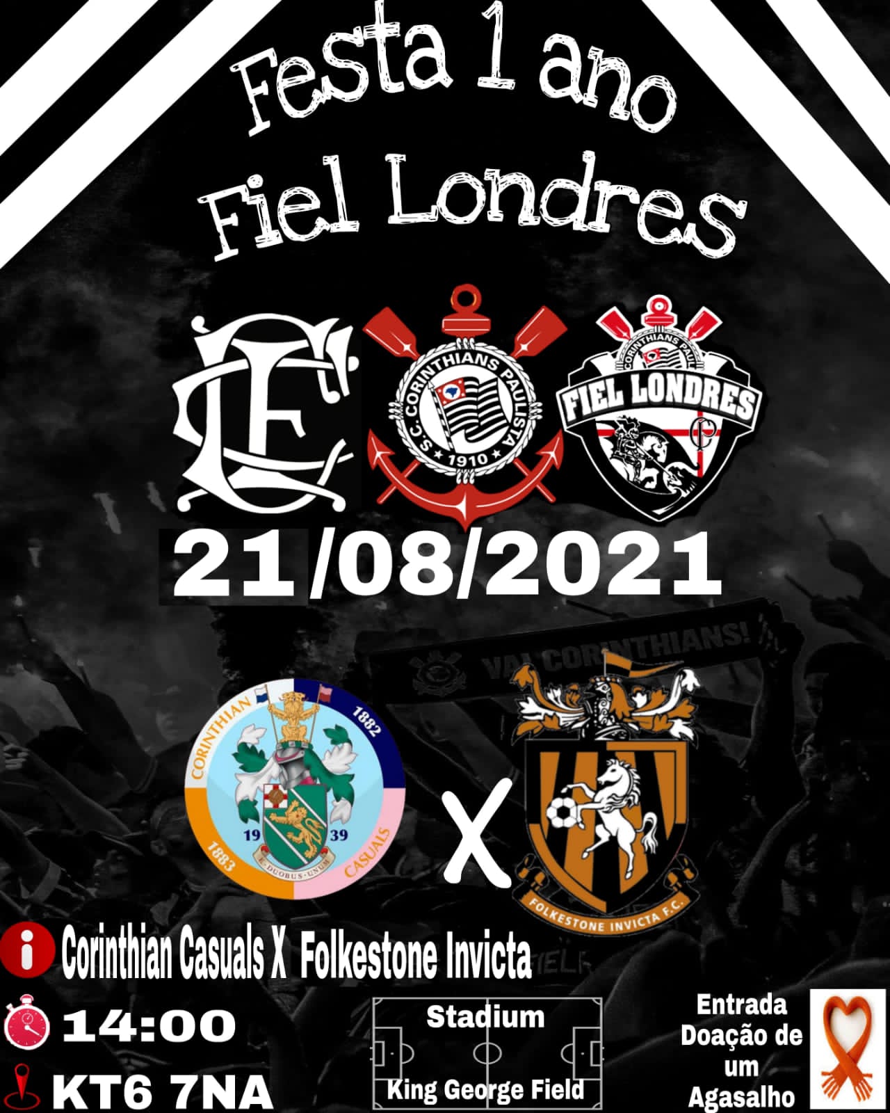 Após o jogo a celebração continuará com música e comida brasileira, sorteio de produtos da Fiel Londres, e os corinthianos poderão conhecer a história do Corinthian-Casuals e tirar uma foto com o Troféu Sócrates, entregue aos ingleses no último encontro entre as equipes. Para entrada no evento basta a doação de uma peça de roupa para a Campanha do Agasalho.
